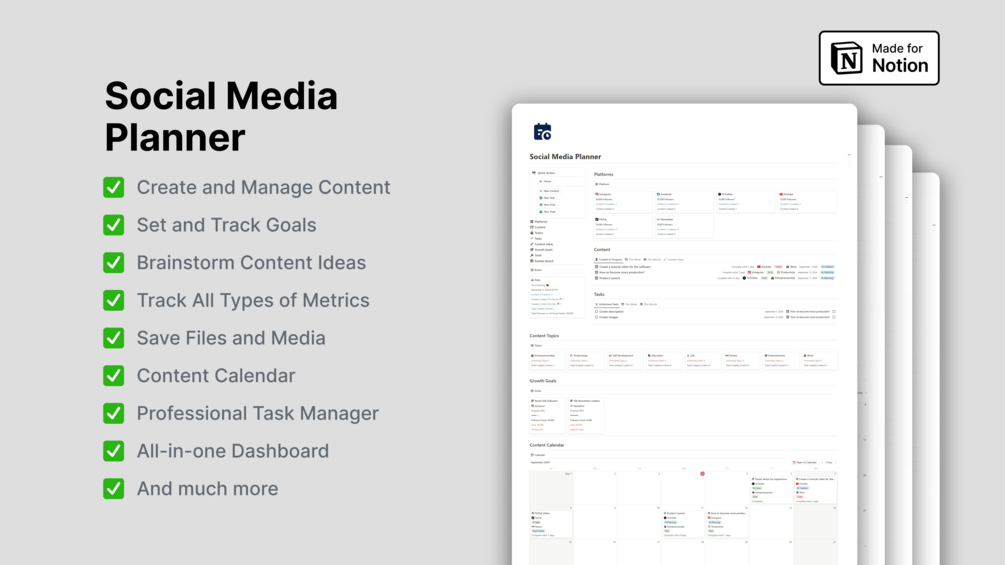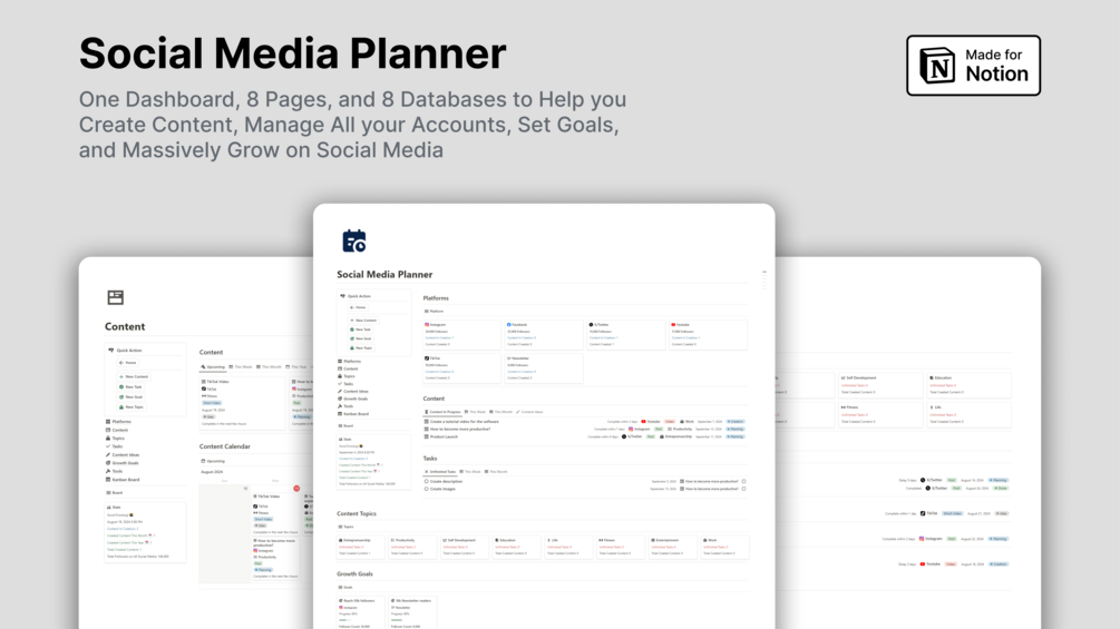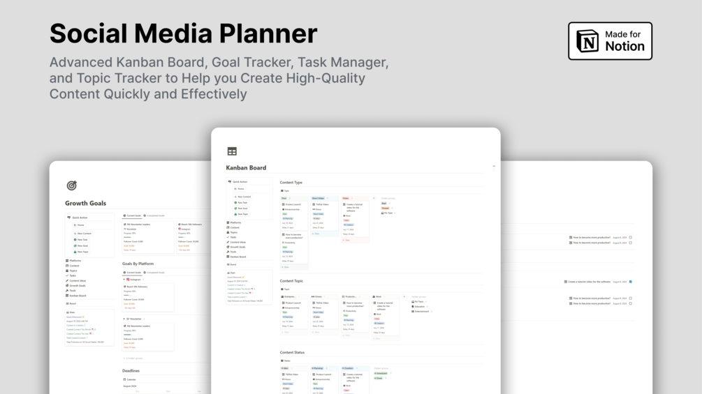 Notion Social Media Planner is a Notion system to help you plan, create, and, schedule content, better manage your Social Media profiles, Track and achieve your growth goals, manage tasks related to content creation, track metrics, manage content using Kanban Board, and much more.