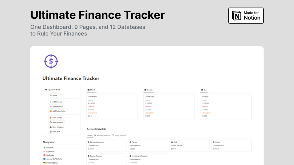 Managing finances can be overwhelming, whether you're managing personal finance or business finance. Notion Ultimate Finance Tracker is an all-in-one solution developed for individuals and business owners seeking clarity and control over their finances.