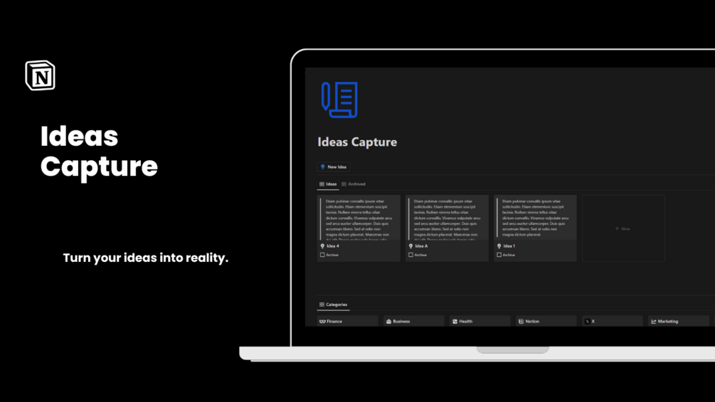 You can input key information about each idea, such as the idea's title, description, and category. The Ideas Capture template will help you maximize productivity and turn your ideas into reality.